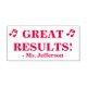 Este design de carimbo encorajador apresenta a mensagem motivadora "RESULTADOS DO EXCELENTE!" e um nome de tutor personalizado. Também apresenta notas musicais decorativas. Ele poderia ser usado por um professor, educador, ou tutor ao marcar trabalhos, para reconhecer que o aluno fez bem.