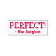Este design de carimbo positivo apresenta a mensagem motivadora "PERFECT!" e o nome de um professor personalizado. Ele poderia ser usado por um professor, educador, ou tutor ao marcar trabalhos, para reconhecer que o aluno fez bem.