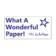 Este design de carimbo encorajador apresenta a mensagem encorajadora "What A Wonmagistral Paper!" (Que Papel Maravilhoso!) e o nome de um professor personalizado. Ele também apresenta uma forma decorativa de contorno de estrela. Ele poderia ser usado por um professor, educador, instrutor ou tutor ao marcar tarefas, para reconhecer que um aluno fez bem.