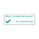 Este design de carimbo positivo apresenta a mensagem positiva "What A Wonmagistral Answer!" e o nome de um professor ou educador personalizado. Também apresenta uma marca de verificação decorativa. Ele poderia ser usado por um professor, educador, ou tutor ao marcar tarefas, para reconhecer que o aluno fez um trabalho de excelente.