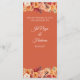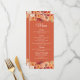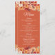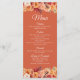 Menu Floral de outono. Colocado sobre um fundo laranja ferrugem, este menu de casamento apresenta flores pintadas por aquarela nas cores perfeitas do outono, cor laranja, esbranquiçada, amarela, vermelha e rosa com sotaques de folhas douradas. Isto é perfeito para estilos clássicos, contemporâneos e casamentos vintage para a estação do outono. Procure a seleção de convites coordenadores, placas RSVP, placas, placas e muito mais.