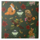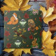 Raposa vermelha, coelho, coruja, marta-luna, pinheira com folhas de outono, abóboras, flores e bolotas num pano de fundo verde profundo