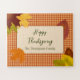 Celebre o Dia de Ação de Graças, a Ação de Amizade, ou qualquer outra ocasião temática do outono com esta divertida e rústica quebra-cabeça de quebra-cabeça do outono. Apresentando um padrão de gingham laranja vintage que lembra um cobertor piquenique, este quebra-cabeça é perfeito para qualquer amante da folhagem de outono. Cada folha é desenhada à mão para a perfeita, de um toque gentil. Um presente de excelente para a família e as crianças se lembrarem de tempos felizes juntos. Texto totalmente personalizável para o seu evento, seja lá o que for.