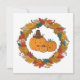 Whimsical autumn scene featuring smiling pumpkins within a vivid leaf wreath. Warm orange, yellow, and earthy greens evoke cozy fall vibes for kids, family apparel, and seasonal decor.