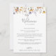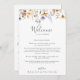 Esta carta de boas-vindas de girassol no outono é perfeita para um casamento rústico. O design apresenta várias cores aquáticas roxas, violetas, flores amarelas, burgundy buds e folhas verdes de azeitona lindamente agrupadas em buquês. Personalize a frente com uma mensagem de boas-vindas para seus convidados e seus nomes. Personalize as costas com a programação de eventos e outras informações úteis.