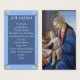 Um cartão de oração com a tradução latina de Hail Mary. A parte de trás do cartão de oração é a pintura de Sandro Botticelli, da Virgem Maria, e da criança Cristo.