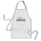 Um avental branco resistente de algodão com a palavra galesa 'cwtch', que significa 'cuddle' ou 'abraço' num guião celta, preenchido com um padrão geométrico vermelho e verde.
