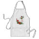 Um touchfinch vermelho e preto perche sobre um galho verde everdeado no topo direito neste avental festivo do Feriado. Na parte inferior esquerda está uma poinsettia e um buquê verde com um cardeal vermelho perky. Entre as imagens está o roteiro vermelho que diz "Feliz Natal", mas você pode facilmente mudá-lo para outra coisa, ou removê-lo completamente. A escolha é sua!