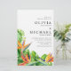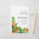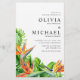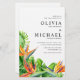 Convide convidados para o seu evento com este convite de casamento personalizável. Apresenta ilustrações aquarelas de estrelitzia ou aves do paraíso, palmeiras e bananeiras. Este convite de casamento tropical é perfeito para verões e casamentos de praia.