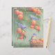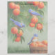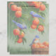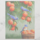 Dois pássaros azuis ocidentais percham numa árvore de pêssego, enquanto um terceiro pássaro azul se senta num cesto de madeira tecido cheio de fruta recém-colhida pronta para comercialização. Acento com um fundo azul correspondente.