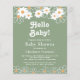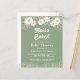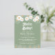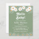 Este convite orçamental para chás de fraldas, neutro em termos de gênero, é decorado com margaridas e tipografia na moda num fundo na moda-verde.