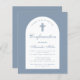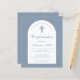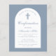Um convite de confirmação moderno para um menino. Em fundo azul empoeirado, ele tem um arco branco com dentro de texto azul empoeirado. A ocasião e o nome são escritos em um roteiro caligráfico elegante; a primeira linha é o texto arquivado.