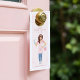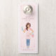 Designs modernas e profissionais de limpeza de casas com cabide de porta, com uma mulher bonita, sorridente e amigável, com uma mão na anca, segurando um balde de água de sabão, e a outra mão segurando uma garrafa de spray de limpeza. A senhora está vestida com um avental listrado rosa e pincelado, uma camisa rosa pincelada e jeans de denim. O verso é projetado de modo limpo e mínimo com alguns dos suprimentos de limpeza adicionados. Personalizado com detalhes de referência, site e identificador social. Um simples, chic, e um cabide na moda para os faxineiros, e muito mais. Todo trabalho de arte de trabalho de arte original por Paparia de Moodthologia.