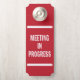 Aviso de reunião em andamento para a empresa ou porta do escritório para alertar os visitantes ou como uma mensagem silenciosa. Altere a cor vermelha de fundo, se quiser.