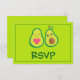 Um cartão RSVP de casamento de hipster com tema de abacate divertido e colorido, este cartão apresenta um fundo verde com um casal feliz representado por abacates. "RSVP" é escrito em fonte verde divertida. As costas também têm texto divertido com fácil preenchimento de modelos. Personalize o seu hoje! Avocado design por Prettygrafik Design (https://www.etsy.com/shop/Prettygrafikdesign)