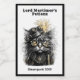 A fierce looking dark gray and black pussy cat wearing a leather hat with steampunk brass on it. A bronze feather tops the cock-eyed hat. This beautiful feline is wearing a golden or amber lensed monocle giving one eye a bronze tone, Around the cats neck hangs a brass trinket of some kind adding to the overall Steampunk attire.