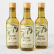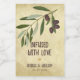 Esta etiqueta rústica para lembranças de casamento com azeite de oliva tem um grande ramo de oliveira com folhas verdes e azeitonas pretas na parte superior. O fundo é de papel antigo. A mensagem "Infundido com amor" e os nomes estão escritos à mão, na parte inferior. Há um coração (falso) dourado acima dos nomes.