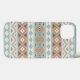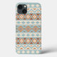 Um design no estilo Aztec em um padrão digital e vetorial em cores azuis, creme e terracota.