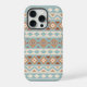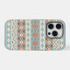 Um design no estilo Aztec em um padrão digital e vetorial em cores azuis, creme e terracota.