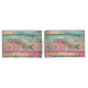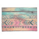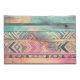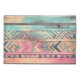 Aztec design tribal, nativo americano, com cor d'água, apresentando um padrão geométrico a sudoeste em tons azuis, cor-de-rosa e laranja pastel sobre fundo de grãos de madeira.
