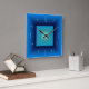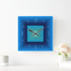 Um bonito relógio azul da cozinha com um centro aqua quadrado. Este relógio é simplista no design e tem números.