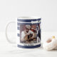 Uma caneca azul escura e branca listrada com suas próprias fotos. As imagens de fundo do texto podem ser excluídas se você não precisar delas. Excelente de aniversário ou Dia de os pais, por exemplo.