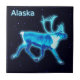 Uma rena ou rena azul brilhante sobreposta a um fundo estelar. A leitura de texto "Alaska" também aparece em azul e branco brilhantes. A rena (Rangifer tarandus), conhecida como rena fora da América do Norte, é um veado do Ártico e Subártico. Embora em geral disseminados e numerosos, algumas subespécies são raras e uma delas se extinguiu. A palavra Inuit tuktu significa veado que nunca pára de se mexer. Desde o início do Verão, desde que se desloquem para o norte até ao neném, até que se desloquem para o inverno e para o sul. Cariou muito em cor e tamanho. Exclusivamente entre os cervídeos, ambos os gêneros cultivam galhos, embora sejam maiores nos machos e há poucas populações onde as fêmeas não possuem completamente. A caça e pastoreio de renas semimdomesticadas (para carne, couros, galhadas, leite e transporte) nas Caraíbas são importantes para várias pessoas árcticas e subárticas. Mesmo muito fora de seu alcance, a rena/rena é bem conhecida devido ao mito, provavelmente originário do início do século XIX, na qual o trenó de Papai Noel é puxado por renas voadoras, elemento secular popular do Natal. Na Lapónia, a rena puxava o pulso. Distribuição e habitat A rena/rena é uma espécie disseminada e numerosa na Holarcta do norte, presente em tundra e taiga (floresta boreal). Ela foi originalmente encontrada na Escandinávia, Europa Oriental, Rússia, Mongólia, e na China norte a norte da 50ª latitude. Na América do Norte, ela foi encontrada no Canadá, no Alasca (EUA) e nos EUA norte conterminados de Washington para Maine. No século XIX, aparentemente ainda estava presente no sul do Idaho. Também ocorreu naturalmente em Sakhalin, na Gronelândia, e provavelmente mesmo em tempos históricos na Irlanda. Durante o final do Pleistoceno, foram encontradas renas tão ao sul como Nevada e Tennessee na América do Norte e Espanhas na Europa. Hoje, então espécies desapareceram de muitas áreas dentro dessa grande faixa histórica, especialmente das partes do sul, onde desapareceram quase em todo lugar. Ainda existem grandes populações na Noruega, na região de Markku, na Finlândia, Suecia, Sibéria, Groenlândia, Alasca e Canadá. As renas Domesticadas encontram-se sobretudo no norte Fennoscandia e na Rússia, com um efetivo de cerca de 150-170 renas a viver em redor da região do Cairngorms, na Escócia. As últimas renas de tundra selvagens que restam na Europa encontram-se em porções do sul da Noruega. Algumas renas da Noruega foram introduzidas na ilha do Atlântico Sul da Geórgia do Sul no início do século 20. Hoje, ainda há dois manadas distintos prosperando lá, separados permanentemente por geleiras. O número total deles não passa de alguns milhares. A bandeira e o casaco de armas do território contêm uma imagem de rena. Cerca de 4000 renas foram introduzidas no arquipélago subantártico francês das Ilhas Kerguelen. A Islândia Oriental tem um pequeno rebanho de cerca de 2500-3000 animais. O número de carneiros e renas flutuou historicamente, mas muitas manadas estão em declínio em toda a sua área. Este declínio global está ligado às alterações climáticas para os efetivos de nortes, renas migratórias e renas e às perturbações industriais do habitat de renas para manadas sedentárias não migratórias. Peles com pelo varia consideravelmente, tanto individualmente como dependendo da estação e subespécie. As populações de nortes, que normalmente são relativamente pequenas, são mais brancas, enquanto as populações do sul, que normalmente são relativamente grandes, são mais escuras. Isso pode ser visto bem na América do Norte, onde a subespécie mais setentrional, Peary Cariou, é a mais branca e pequena subespécie do continente, enquanto a subespécie mais setentrional, Woodland Cariou, é a mais escura e maior. O casaco tem duas camadas de pelo, um coalete grosseiro e grosseiro e um casaco de cabelos longos, composto por cabelos ocos, cheios de ar. Anéis de renas crescem novamente a cada ano sob uma camada de pelo chamada veludo. Na maioria das populações, ambos os sexos cultivam galhos, que (na variedade escandinava) para os machos velhos cai em dezembro, para os machos jovens na primavera inicial e para as fêmeas no verão. Os cilindros normalmente têm dois grupos separados de pontos, um inferior e outro superior. As renas Domesticadas são de pernas mais curtas e mais pesadas que os seus homólogos selvagens. Há uma variação subespecífica considerável no tamanho das galhadas (por exemplo, preferencialmentes pequenas e espinhosas na subespécie mais setentrional), mas em algumas subespécies as galhadas das renas são a segunda maior de qualquer veado existente, depois do alce, e podem chegar a 39 polegadas (100 cm) de largura e 53 polegadas (135 cm)) em comprimento da viga. Eles têm os maiores traficantes em relação ao tamanho do corpo entre veados.O tamanho de Antler tem um papel significativo no estabelecimento da hierarquia de grupos. Nose e cascos Reindeer tem narizes especializados que apresentam ossos nasais turbinados que aumentam drasticamente a área de superfície dentro das narinas. O ar frio de entrada é aquecido pelo calor corporal do animal antes de entrar nos pulmões, e a água é condensada a partir do ar expirado e capturada antes da expiração do ar do veado, usada para humedecer o ar de entrada seco e possivelmente absorvida pelo sangue através das mucosas. As cascas de renas se adaptam à estação: no verão, quando a tundra é macia e molhada, as pegadas se tornam esponjas e proporcionam tração extra. No inverno, as almofadas encolhem e apertam, expondo a borda do casaco, que corta o gelo e cruza a neve para evitar que escorregue. Isso também permite que escavem (uma atividade conhecida como "cratering") através da neve até sua comida favorita, uma líquen conhecida como musgo de rena. Os joelhos de muitas espécies de renas são adaptados para produzir um som de