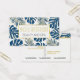 Cartões de visitas clássicos de folhas tropicais azuis e douradas. Esta design apresenta folhas de Split Leaf Philodendron (Monstera deliciosa) ou de Queijo Suíço e folhas de palma em azul com contorno de ouro. Seu texto está em um quadro branco com contorno de ouro.