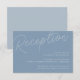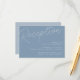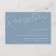 Um pequeno cartão de inclusão de convite de casamento para os detalhes da sua recepção, com "Recepção" no topo em letra cursiva, e os detalhes da sua recepção alinhados à direita inferior. Projetado para combinar com nossa coleção de casamento com Marca D'água em Letra Script. Nossa paleta de cores Azul Empoeirado é uma mistura elegante de azuis etéreos, com letras brancas e azul-acinzentadas em um fundo azul médio empoeirado.
