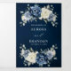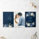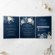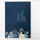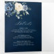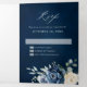 Convite Tri-Fold de casamento floral azul empoeirado com buquê elegante de azul marinho, azul real, branco, dourado, marfim champanhe, rosa cor de blush, botões de ranúnculo e folhas de eucalipto verde-sage e buquê de aquarela elegante. Entre em contato comigo para obter ajuda na personalização ou se precisar de qualquer outro produto com este design.