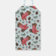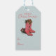 Este slogan de presente To/From, apresenta um par desenhado à mão de botas de natal de vaquinha sentadas entre pinecones, pínus e bagas ocas na frente. A parte de trás apresenta um padrão divertido com estes mesmos elementos ocidentais. Fundo azul macio legante.
