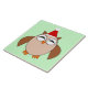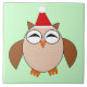 Este azulejo incrível apresenta uma engraçada caricatura de uma coruja de Natal com olhos sonolentos, um pequeno bico laranja e pequenos pés laranja bonitos. A coruja é marrom com uma barriga de creme e está vestindo um chapéu de Papai Noel vermelho e branco pronto para o Natal.