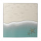 Um azulejo cerâmico que tem uma bela ilustração de uma praia arenosa e ondas de ruptura, com dois estrelas-do-mar no oceano.