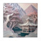 Um adorável azulejo de cerâmica paisagístico com montanhas, pavilhão e árvores.