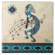Brilhe sua casa com este Azulejo de cerâmica do sudoeste de Kokopelli único "Um dos tipos"! Ele apresenta um Turquesa no sudoeste de Kokopelli tocando flauta com notas musicais, dançando ao redor de um cacto sob o sol em um fundo de arenito de latão...e uma borda inferior em Turquesa, Dourada, enferrujada e branca! Esta é uma Design de Arte Original do Artista Kerry Miller.