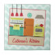 Um azulejo da cozinha que caracteriza uma ilustração de uma cozinha inspirada retro decorada com um vermelho, uma turquesa, uma laranja, e um esquema de cores amarelo. Personalize com seu nome no vermelho. O fundo é claro - azul com ziguezagues.