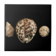 Uma fotografia de vida estática de três conchas avistadas alinhou-se, com a maior no meio, sobre um fundo preto.