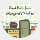 Cena da cozinha da Groovy com refrigerador e fogão retro colorido ou forno "da minha cozinha", etiquetas adesivas para etiquetas de presentes ou etiquetas para chefs pessoais ou privados, classes de cozinhar ou instrução culinária, cozinhar italiano, restauração ou outro cozinhar do estilo doméstico. Contador de cozinha cheio de tomate, alho, pimentos, queijo, azeitonas e molho de tomate mergulhado no fogão.