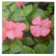 Este incrível azulejo apresenta uma fotografia de duas bonito flores cor-de-rosa impacientes e a folhagem circundante. As pétalas brilham e as folhas estão molhadas por uma tempestade.