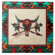 Aproxime sua casa com este único "Um dos tipos" crânio de Buffalo e lança Azulejo cerâmico! Ele apresenta um crânio nativo americano de Buffalo e setas com penas em um fundo de arenito de Tan... cercado por uma borda sudoeste em Turquesa, Laranja e Preto!