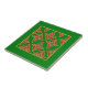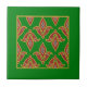 Um azulejo quadrado de cerâmica com um padrão de "fleur-de-lys" em vermelho profundo e ouro sobre fundo verde escuro, de um design pintado digitalmente por Judy Adamson.