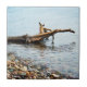 Uma fotografia de uma árvore morto lavou uma costa para uma praia rochosa.
