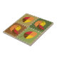 Quatro quadrados são decorados com folhas e abóboras em tons de outono de vermelho, laranja, amarelo e marrom. A costura branca adiciona um toque decorativo, dando ao padrão repetitivo a aparência de uma colcha, criando um sentimento perfeitamente aconchegante para o outono. Este azulejo pode ser enquadrado para criar um trivial ou colocar dentro a tampa da caixa de presente de madeira. Azulejos sem um quadro também ajustado a caixa-presente grande para criar um conjunto correspondente.