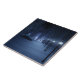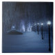 Um caminho coberto de neve que percorre a floresta de pássaros em uma noite escura de inverno. O caminho é alinhado com postes que exibem um brilho azul prateado, mas nas sombras estão formas brilhantes e mesmerizantes como pequenas luzes de fada, atraindo o viajante para fora da trilha. À distância, o brilho lavanda de uma misteriosa floresta se juntando ilumina o céu frio.
