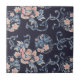 Padrão tradicional japonês, com flores e vinhas cor-de-rosa, azuis e brancas, sobre fundo azul escuro.