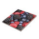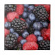 Fotografia de framboesas de verão coloridas, amoras-negras e mirtilos impressos nas bordas do azulejo.