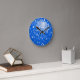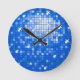 Relógio de parede com um padrão impresso estilizado e divertido de "azulejo espelho da discoteca" em tons de azul e branco. Pode ser usado como um fundo para o seu próprio texto, imagens e ideias. Observe que esta é uma imagem de arte digital impressa, ela não brilha ou contém espelhos reais ou brilho.