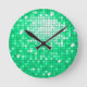Relógio de parede com um padrão impresso de "azulejo espelho disco" divertido e estilizado em tons de verde e branco. Pode ser usado como um fundo para seu próprio texto, imagens e ideias. Observe que esta é uma imagem de arte digital impressa, ela não brilha ou contém espelhos reais ou brilho.