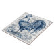 Este trabalho de arte mostra azulejos azulejo incrivelmente detalhados, azuis e brancos, que mostram um galo lindamente detalhado em meio a padrões florais.