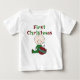 Um bebê bonitinho com um dorminhoco verde com um grande ornamento de árvore vermelha e verde e texto vermelho e verde tradicional que diz "Primeiro Natal" em T-shirts, jossutis, sacos de tote e outros itens que você pode personalizar facilmente antes de fazer pedidos com o nome do seu bebê!